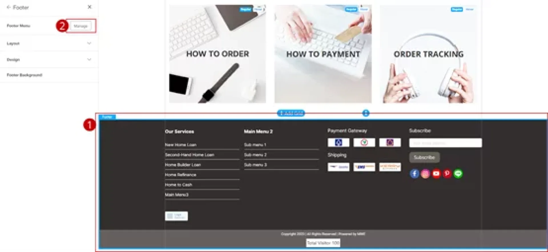การปรับแต่งรูปแบบส่วนล่าง (Footer) ส่วนที่จะติดไปทุก ๆ หน้าของเว็บไซต์ ซึ่งตำแหน่งจะอยู่ที่ด้านล่างสุดของเว็บไซต์ เป็นส่วนที่แสดงข้อมูลการติดต่อ ทั้งที่อยู่ เบอร์โทรศัพท์ ช่องทางโซเชียล หรือเมนู
