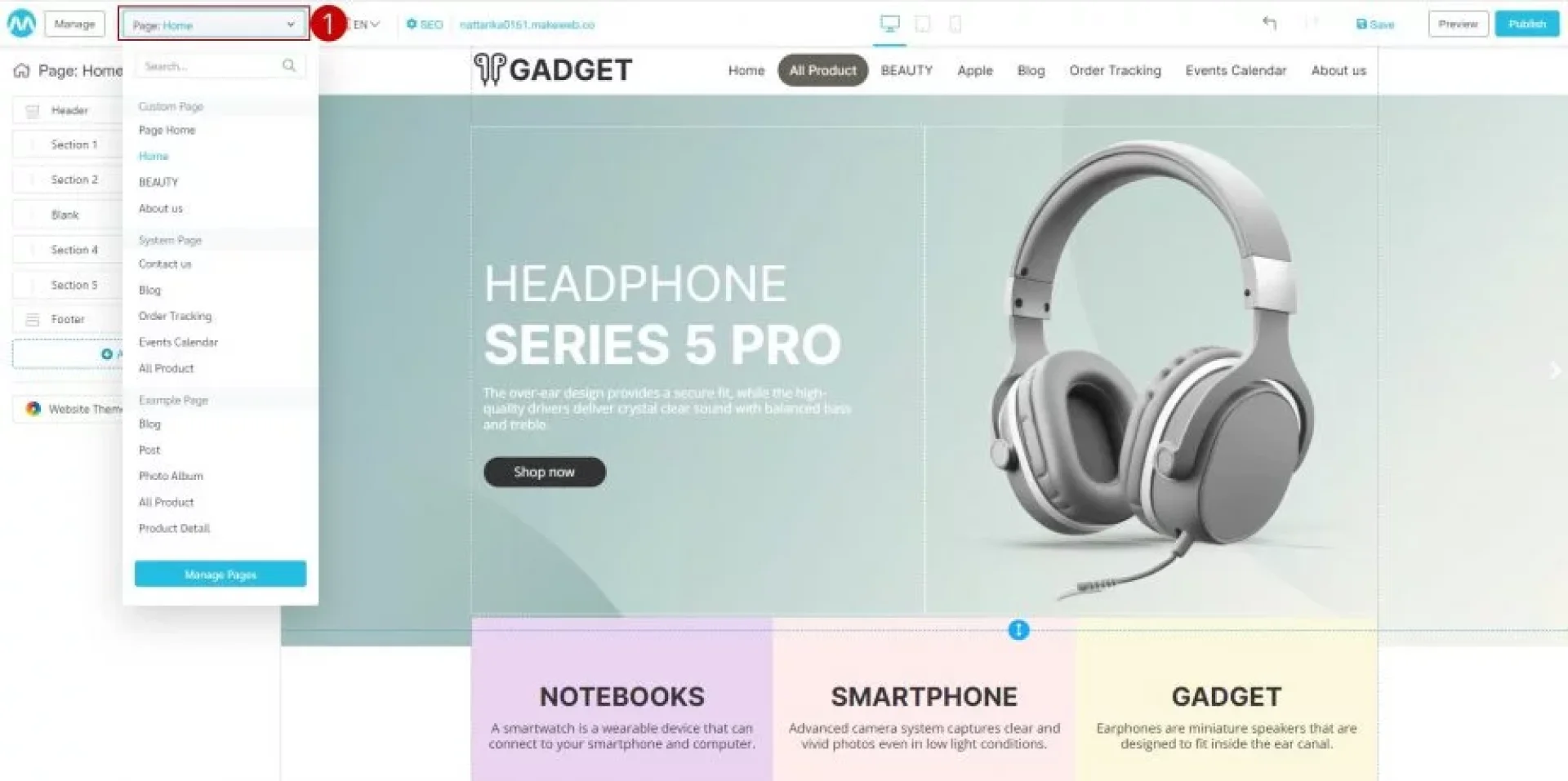 1. คลิกที่แถบ หน้าเพจ (Page) ด้านบนซ้าย ระบบจะแสดงรายชื่อเพจทั้งหมดที่มีบนเว็บไซต์