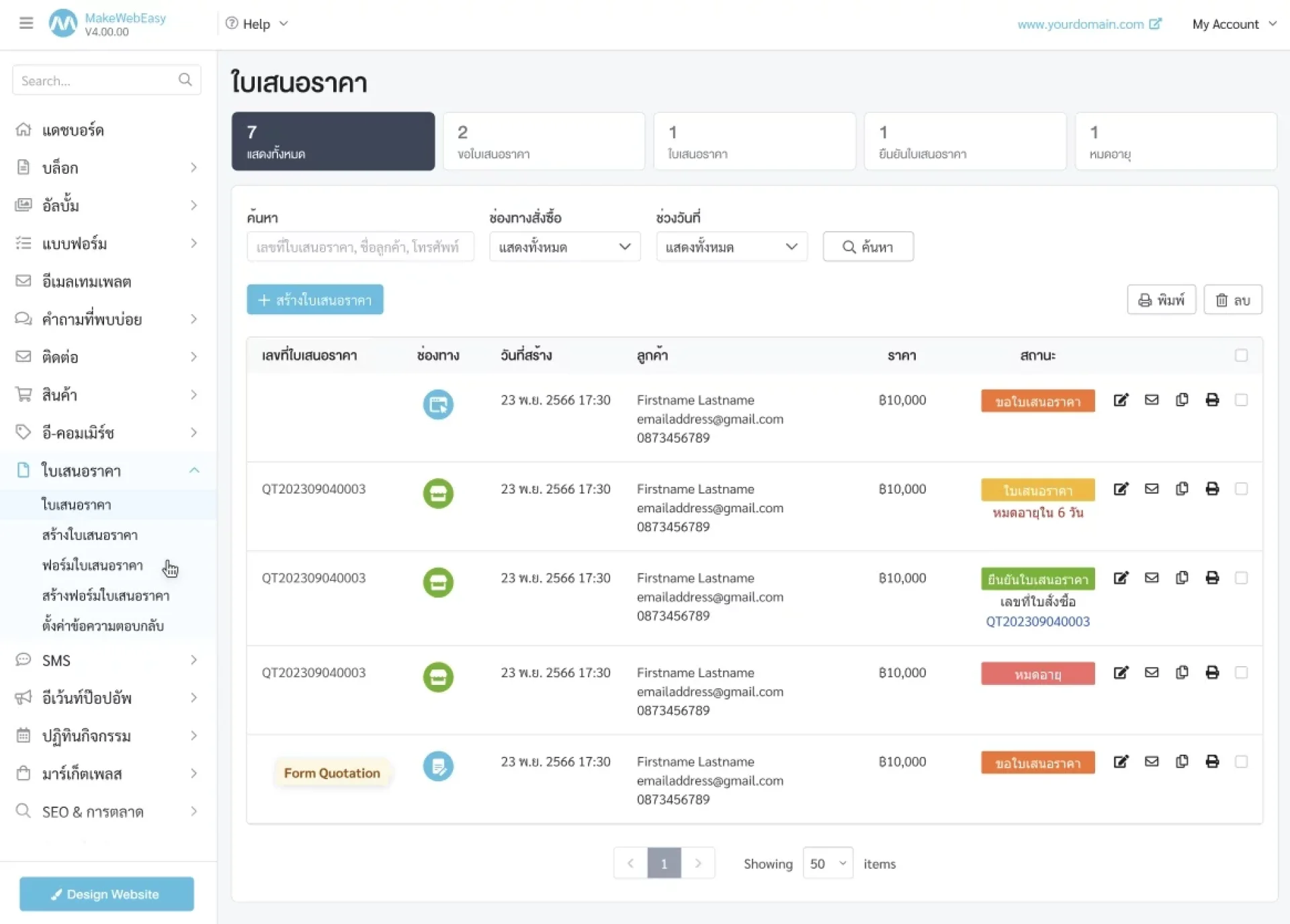 ฟีเจอร์ใบเสนอราคาจะอยู่ที่ เมนูจัดการเว็บไซต์ > ใบเสนอราคา