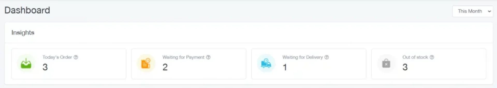 เซคชั่นที่แสดงสถานะคำสั่งซื้อทั้งหมดที่ต้องจัดการ ได้แก่ จำนวนคำสั่งซื้อวันนี้ / จำนวนคำสั่งซื้อที่การรอชำระเงิน / จำนวนคำสั่งซื้อที่รอการจัดส่ง และจำนวนสินค้าที่หมด เป็นส่วนที่เพิ่มเข้ามาใหม่