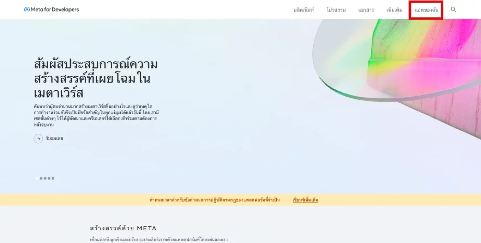 1. ไปที่ URL https://developers.facebook.com/ เลือก เข้าสู่ระบบ (Log in) ที่มุมขวาบนของเมนู