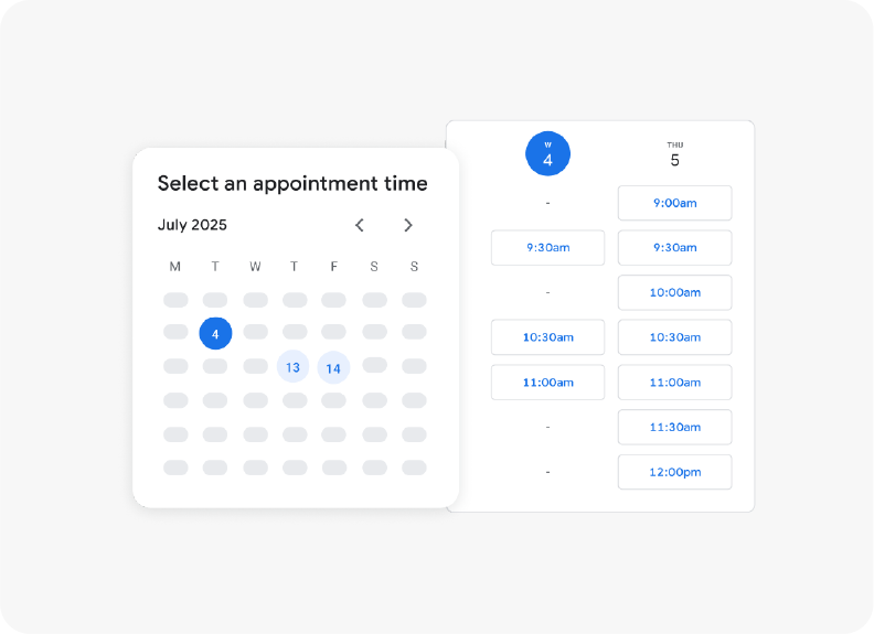 หน้าการจองจะช่วยให้คุณจัดการเวลาว่างและช่วยให้ลูกค้าและพาร์ทเนอร์จองเวลานัดหมายกับคุณได้โดยตรงใน Google ปฏิทิน เพียงสร้างหน้าการจอง ปรับเวลาว่างสำหรับการนัดหมาย และแชร์ลิงก์กับผู้อื่น จากนั้น การนัดหมายที่จองไว้ทั้งหมดจะปรากฏในปฏิทินโดยอัตโนมัติ
